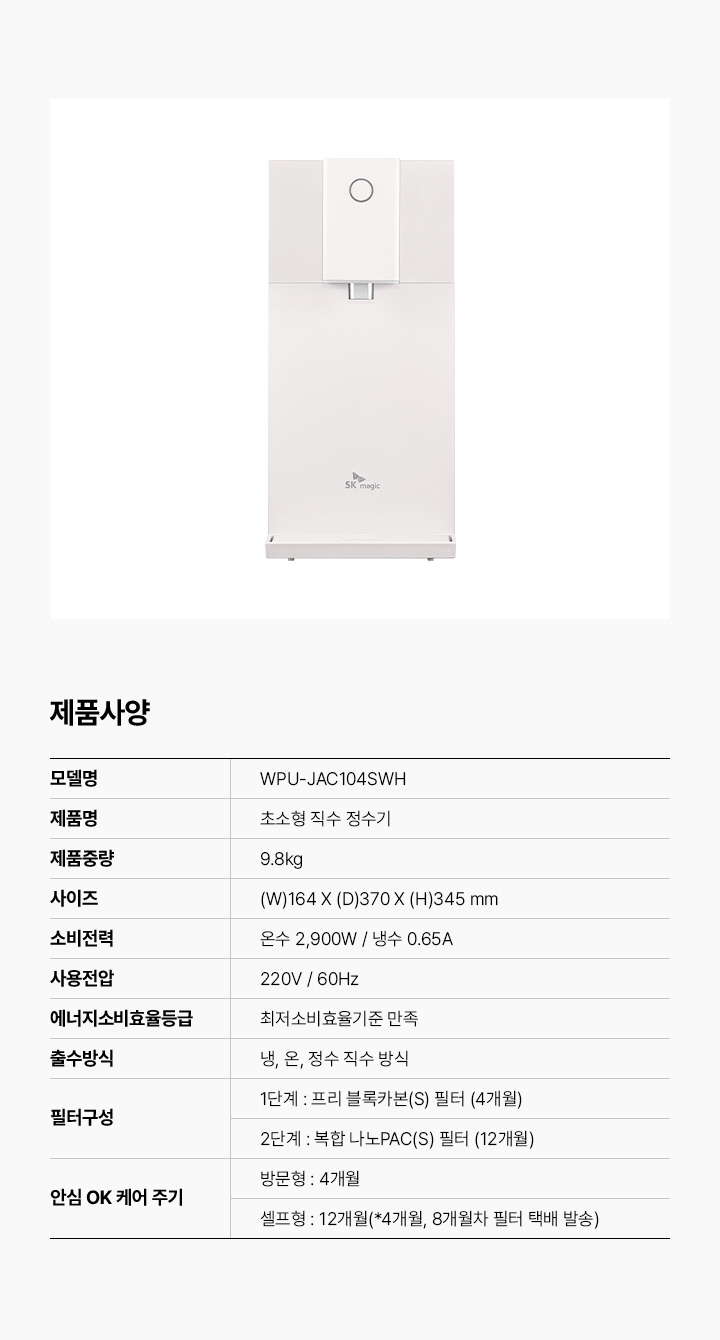 [방문관리] SK매직 초소형 직수 냉온정수기 WPUJAC104S(WH/PP/PB)